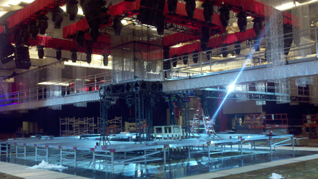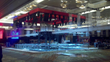 We set up the catwalk, stage, and lighting equipment for the annual New Year’s celebration at the Aria Hotel and Casino. This event draws hundreds of locals and invited guests alike each year as they ring in the New Year right in the heart of the Las Vegas Strip. We installed the truss foundation for a visually appealing display of lights with a colorful fabric liner to give the appearance of elegance and style and to cover any unsightly wiring. The catwalk was used as a dance floor for entertainers who performed along its length for the duration of the evening. Other decorations and scenic elements were hung from the ceiling throughout the ballroom to add a majestic effect.