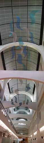 Tally Fisher and Rob Fisher Sculpture hired Rigging Technologies to install the suspended sculpture titled “Sea Change”. The location of the job was in a long corridor of the United States Naval Hospital in Guam. The artwork was suspended using expansion bolts and wire to span the long stretch of the corridor ceiling.